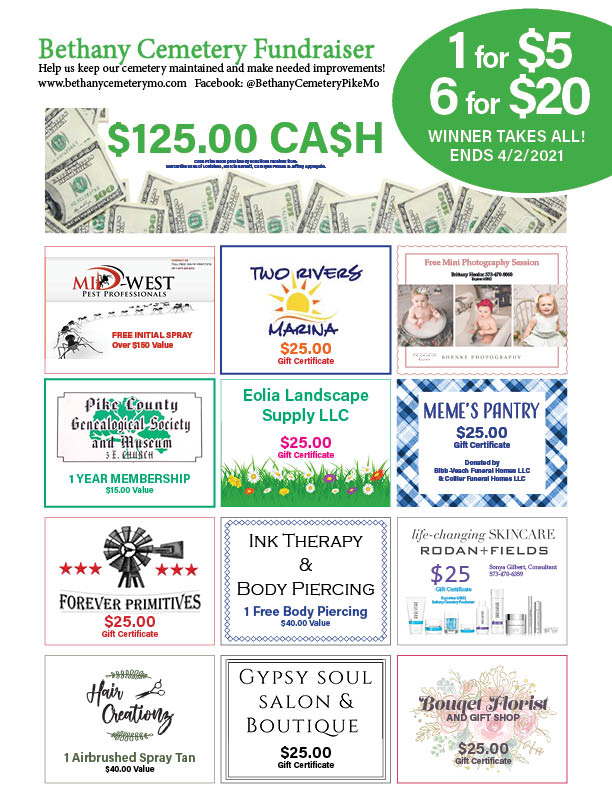 Get yours online by using paypal: paypal.me/bethanycemetery – just tell us your name and phone number! OR contact Tracy Brookshier 314-971-5886 or Lesli Stross 573-721-1687.